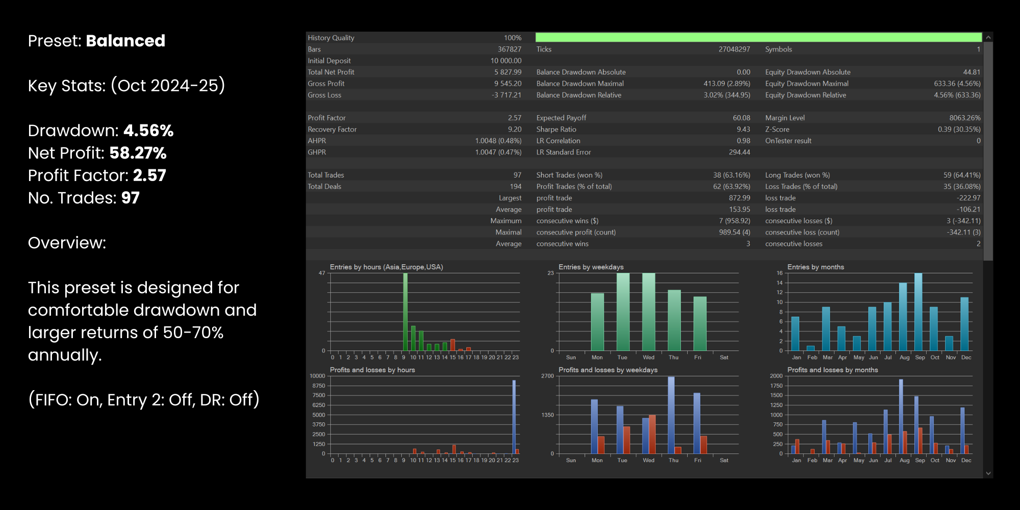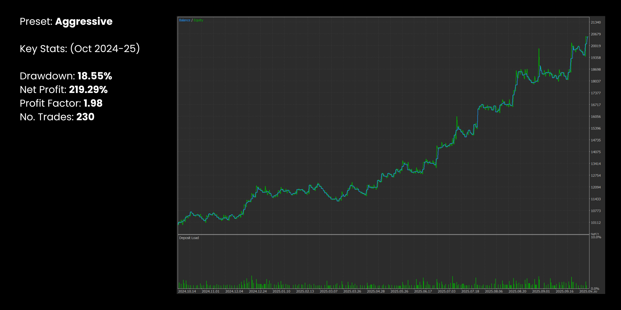 BlakBox applies a proven trading edge with built‑in risk management, backed by 10 years of profitable backtests and live performance. The Dynamic Risk feature adjusts position sizing based on setup quality.